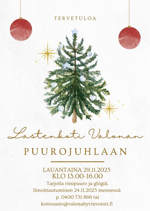 Lämpimästi tervetuloa aiemmat nuoret ja henkilökunta lastenkodin perinteiseen puurojuhlaan lauantaina 29.11.2025 klo 13–16. Tarjolla riisipuuroa ja glögiä.